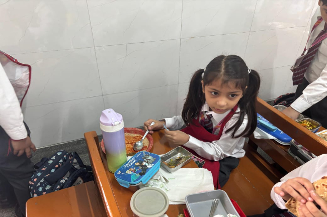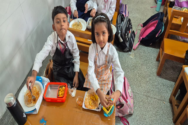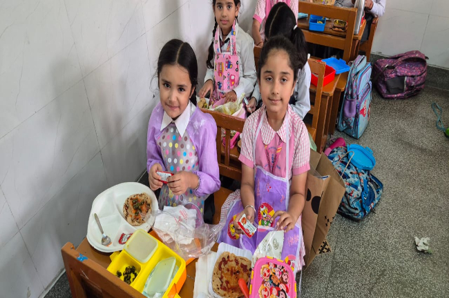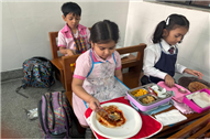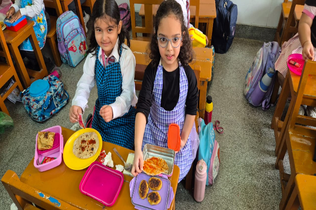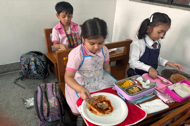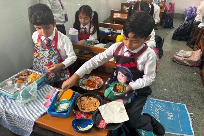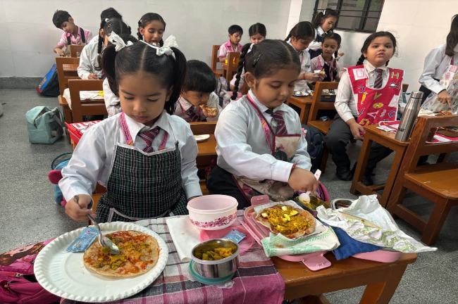 Nursery: Our youngest cooks made Churmuri using puffed rice, chopped onion, tomatoes, cucumber and boiled potatoes. With tiny hands and big smiles they mixed everything together, added a pinch of salt and chaat masala, and relished the crunchy, tangy snack they created themselves. The joy of tasting their own recipe was priceless!